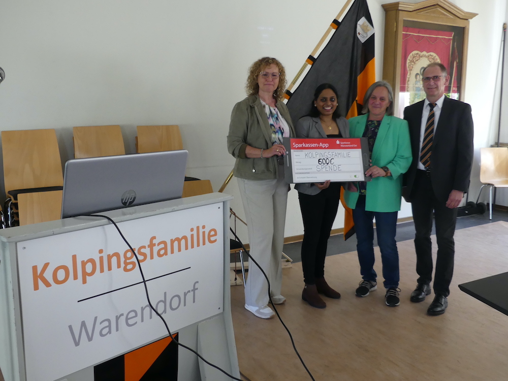 Beim Josefschutzfest der Kolpingsfamilie Warendorf berichteten Ulrike Klemann (2.v.r) und Jesintha Sivapiragasam (3.v.r) über ihr Medizinisches Projekt in Sri Lanka. Dazu überreichten Ralf Erpenbeck vom Vorstandsteam (rechts) und Susanne Korte (links) eine Spende