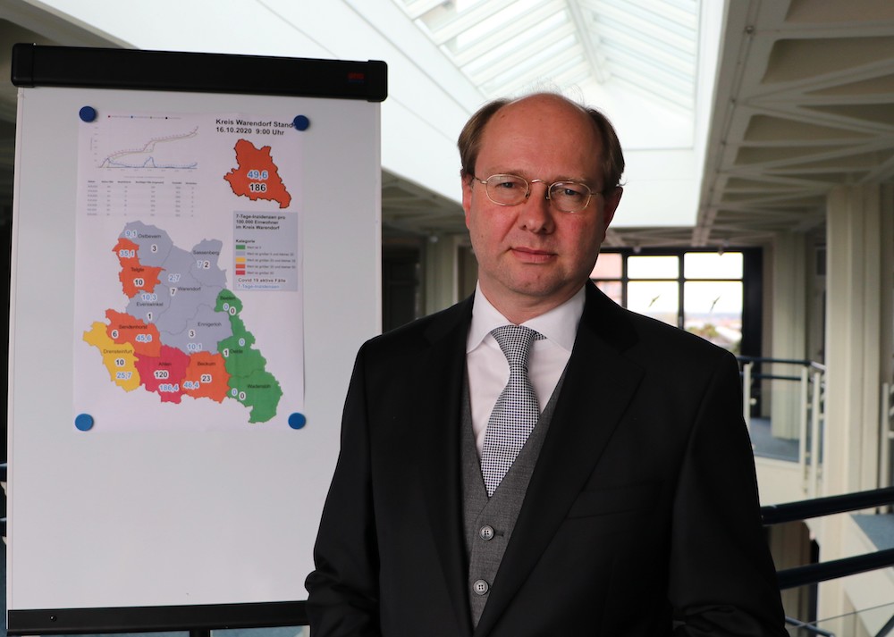 Dringend erwartet wurde im Warendorfer Kreishaus am Freitagabend die neue Coronaschutzverordnung des Landes. Diese sieht jetzt unter anderem mögliche Ausnahmen von den strengeren Regeln für einzelne Orte vor, in denen es kein nennenswertes Infektionsgeschehen gibt. „Wir werden diese neue Möglichkeit genau prüfen und Anfang der Woche nach Rücksprache mit der Bezirksregierung und dem Landeszentrum für Gesundheit entscheiden, welche Orte im Kreisgebiet wir von den verschärften Vorschriften ausnehmen können. Die neue Regelung begrüße ich sehr – ich hätte sie mir schon viel früher gewünscht“, sagte Landrat Dr. Olaf Gericke mit Rückblick auf den Tönnies-Ausbruch im Juni, der nur einige Orte betraf und bekanntlich dennoch für den gesamten Kreis zum Lockdown führte. „Das ist eine gute Nachricht. Sobald es die Chance gibt, Ausnahmen festzulegen, werden wir sie nutzen“, so der Landrat.