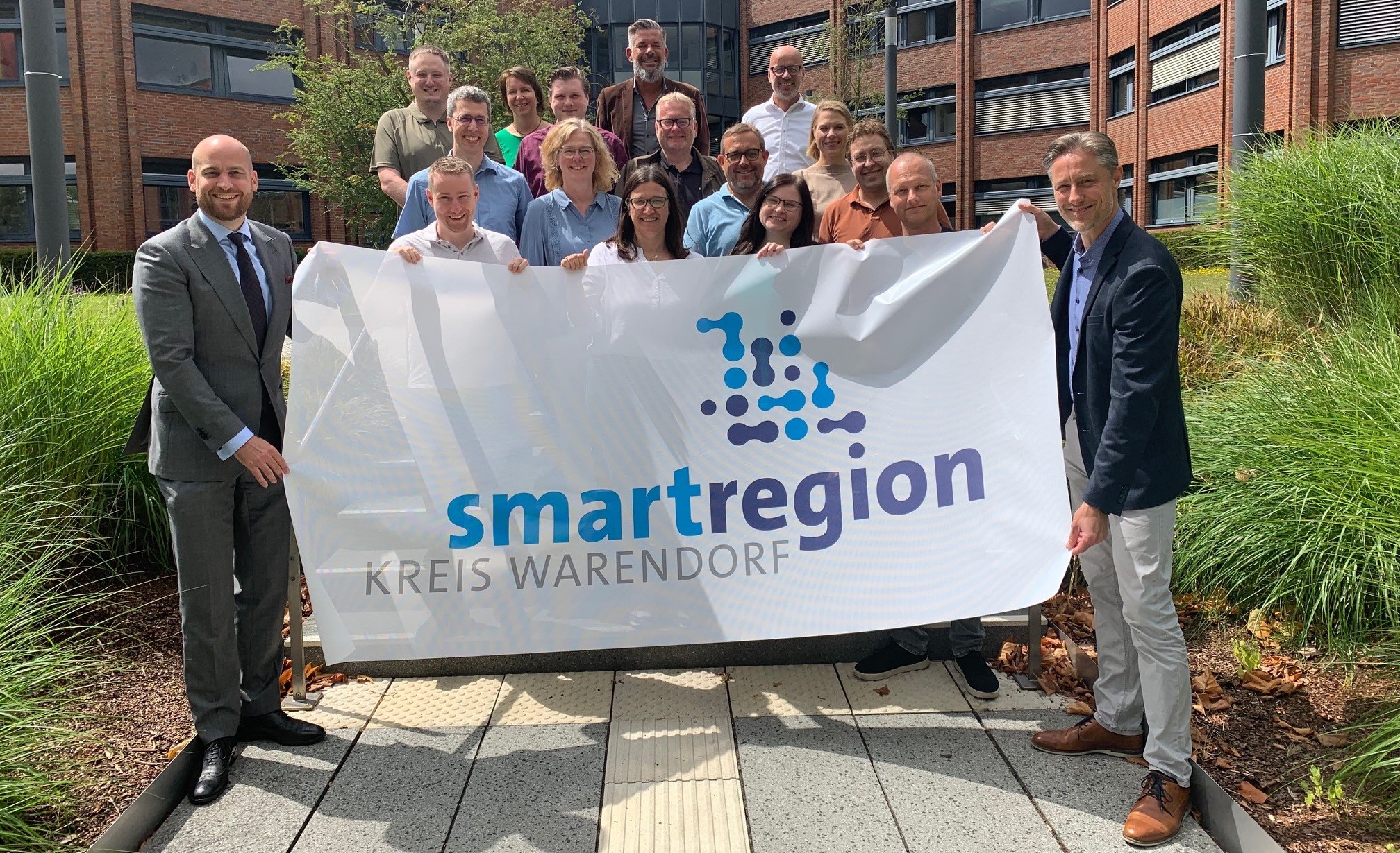 Michael Ottmann (v. l. Dezernent für Bauen, Planung und Umwelt des Kreises Warendorf), Andreas König (Stadt Sassenberg), Maximilian Hegemann, (Stadt Beckum), Elmar Wendland (gfw), Yvonne Ganzert (Gemeinde Ostbevern), Michael Averbeck (Gemeinde Beelen), Sylvia Hohenhorst (Gemeinde Wadersloh), Karina Benjilany (Stadt Ahlen), Philip Wettengel (Stadt Sendenhorst), Martin Sasse (Stadt Ennigerloh), Niko Ritter (Stadt Drensteinfurt), Lara Sommerhage (Stadt Telgte), Ulrich K. Butterschlot (Geschäftsführer Stadtwerke Warendorf), Kristin Möwes (Gemeinde Everswinkel), Jan-Frederik Mier (Stadt Oelde), Rudolf Prinz (Stadt Warendorf), und Daniel Höing (Kreis Warendorf) vernetzen Kreis und Kommunen zu einer Smart Region.“