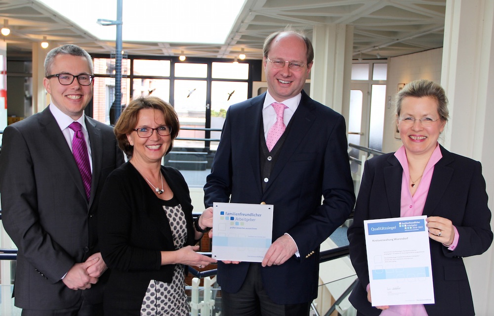 Erneut hat die Kreisverwaltung ihre familienfreundlichen Arbeitsbedingungen unter Beweis gestellt. Der Kreis Warendorf ist nun schon zum zweiten Mal mit dem von der Bertelsmann-Stiftung verliehenen Qualitätssiegel „familienfreundlicher Arbeitgeber“ zertifiziert worden. Die aktuelle Auszeichnung gilt für den Zeitraum 2018 bis 2021. Bereits 2011 hatte die Kreisverwaltung zudem das Siegel „Familienfreundlicher Mittelstand“ im Münsterland (FAMM) erhalten. „Familie, Pflege und Beruf miteinander zu vereinbaren, ist für uns seit Jahren ein wichtiges Thema. Auch in dem zweiten Erneuerungsverfahren ist uns ein konsequenter Weiterentwicklungsprozess bescheinigt worden“, freut sich Landrat Dr. Gericke. „Wir sind motiviert, für unsere Mitarbeiterinnen und Mitarbeiter auch weiterhin an diesem Thema zu arbeiten.“