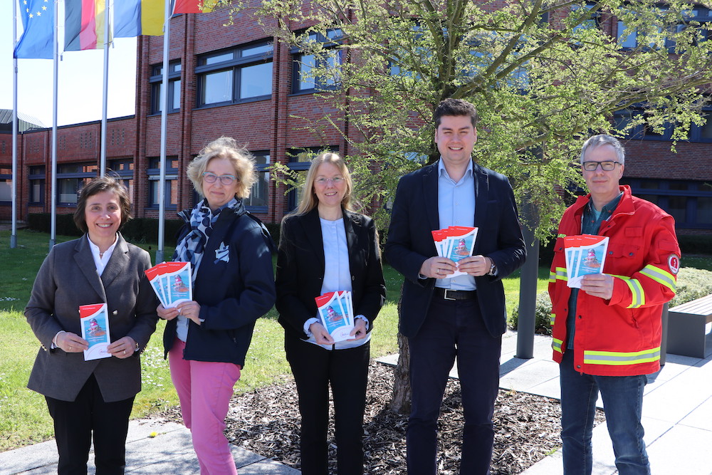 Gesundheitsdezernentin Dr. Anna Arizzi Rusche (v. l.), Sabine Lillmanntöns (KSB), Petra Lummer (Gesundheitsamt), Dr. Tim Kornblum (Leiter Gesundheitsamt) und Rainer Lillmanntöns (DLRG, Kooperationspartner) präsentieren die Flyer, die jede Familie bei der Schuleingangsuntersuchung erhält.
