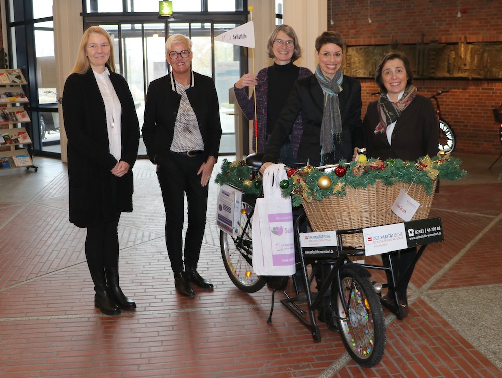 Gesundheitsplanerin Petra Lummer, Sozialdezernentin Brigitte Klausmeier, Sabine Tenambergen, Christiane Vollmer (beide Selbsthilfe-Kontaktstelle) und Gesundheitsamtsleiterin Dr. Anna Arizzi Rusche freuen sich, dass das adventlich geschmückte Selbsthilfe-Fahrrad wieder im Kreishaus steht.