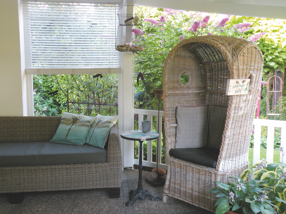 Von dort aus hat man einen wunderbaren Blick auf die Sonnenecke, im hinteren Teil des 800 qm großen Grundstücks. Die Clematis „Princess Kate“ hat ein neues zuhause an der weiß gestrichenen Holzveranda bekommen und fühlt sich dort in der Sonne sehr wohl. Die Staude ist weiß, mit rot-lilafarbener Haube und zeigt ihre Blüten von Juni bis September. Ein echter Hingucker.