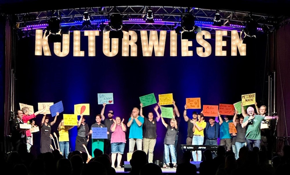 Mit großer Freude und einem riesigen Dankeschön verabschieden sich die Kulturwiesen 2024. Das magische Dreieck des Zusammenspiels zwischen dem Publikum, dem gesamten Team und den Bühnengästen glänzte nicht zuletzt auch durch das Bilderbuchwetter an allen zwölf Veranstaltungsabenden. Da können sich die Gäste im schönsten Freiluftsaal des Münsterlandes absolut sicher sein, wer Kulturwiesen bucht der hat eine Schönwettergarantie zu 99,99 Prozent sicher. Angesprochen von den Künstlerinnen und Künstlern finden immer mehr Menschen jährlich den Weg auf den Hof Schulze Wettendorf, wobei mehr als dreiviertel des Publikums sich mittlerweile zu Dauergästen entpuppen, denn nicht etliche sind seit Jahren mit Begeisterung in Wettendorf dabei. Der kleine Bilderladen aus Wolbeck mit seiner Kunstaustellung, die frisch vor Ort zubereiteten Speisen und die mit Wonne gereichten gepflegten Getränke aus den Händen des Vereins Freude über Freude locken die Freundinnen und Freunde von Kunst und Kultur pünktlich zum Einlass weit vor Showbeginn.