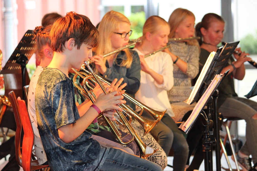 Den Rhythmus der Musik aufgreifend, marschierten die jüngsten Konzertanten der Bläserklasse mit ihren Instrumenten in die Aula und eröffneten mit „When the Saints go marchin‘ in“ das Sommerkonzert des Mariengymnasiums Warendorf. In Kooperation mit der Kreismusikschule Beckum-Warendorf und unter der Leitung von Peter Behrens demonstrierten sie ihre Fortschritte aus einem Jahr Instrumental- und Ensembleunterricht und brachten mit der Titelmelodie zum Filmklassiker „Star Wars“ sowie einem Queen Medley bereits anspruchsvolle mehrstimmige Bläserarrangements selbstbewusst auf die Bühne.