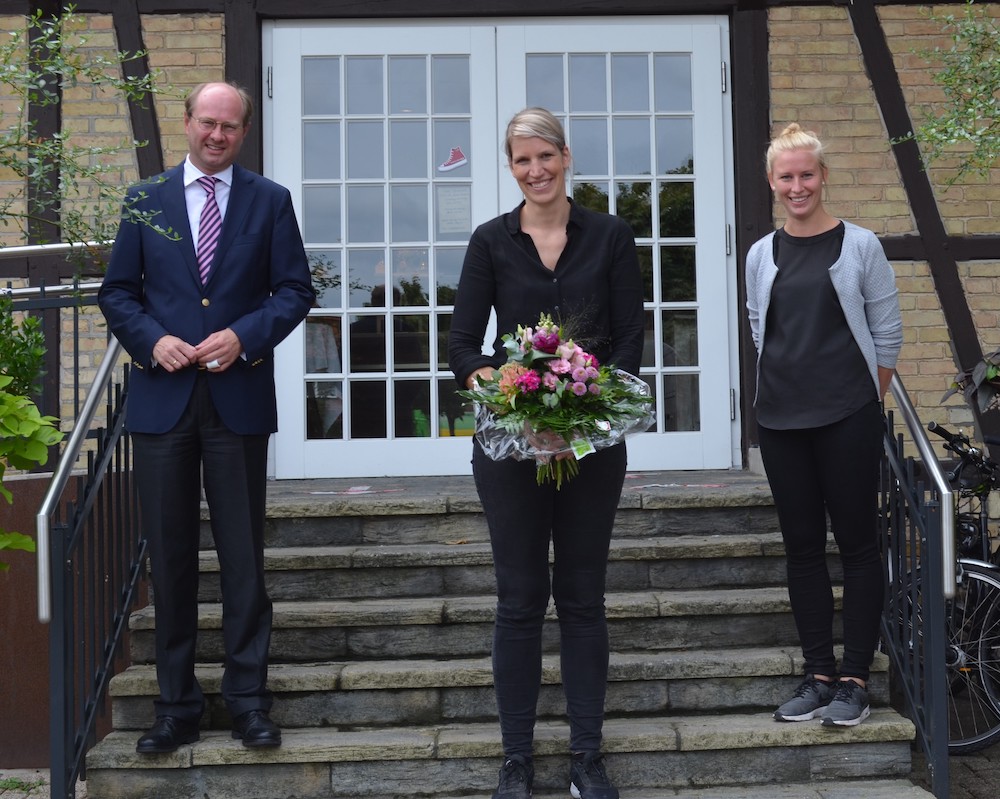 Einen Blumenstrauß überreichte Landrat Dr. Olaf Gericke der Beelenerin Tina Behnke zum Dank für ihr couragiertes Handeln. Sie hatte einem Mann aus Afghanistan nach einem medizinischen Notfall vor ihrem Café geholfen und war danach in einem anonymen, rassistisch motivierten Brief kritisiert worden. „Ausländerfeindlichkeit darf keinen Platz in unserer Gesellschaft haben. Es ist schön zu wissen, dass bei uns im Kreis Menschen wie Frau Behnke leben, die entschlossen für Andere einstehen“, sagte Landrat Dr. Olaf Gericke. „Der Kreis Warendorf kann stolz auf solch couragierte Bürgerinnen und Bürger sein.“