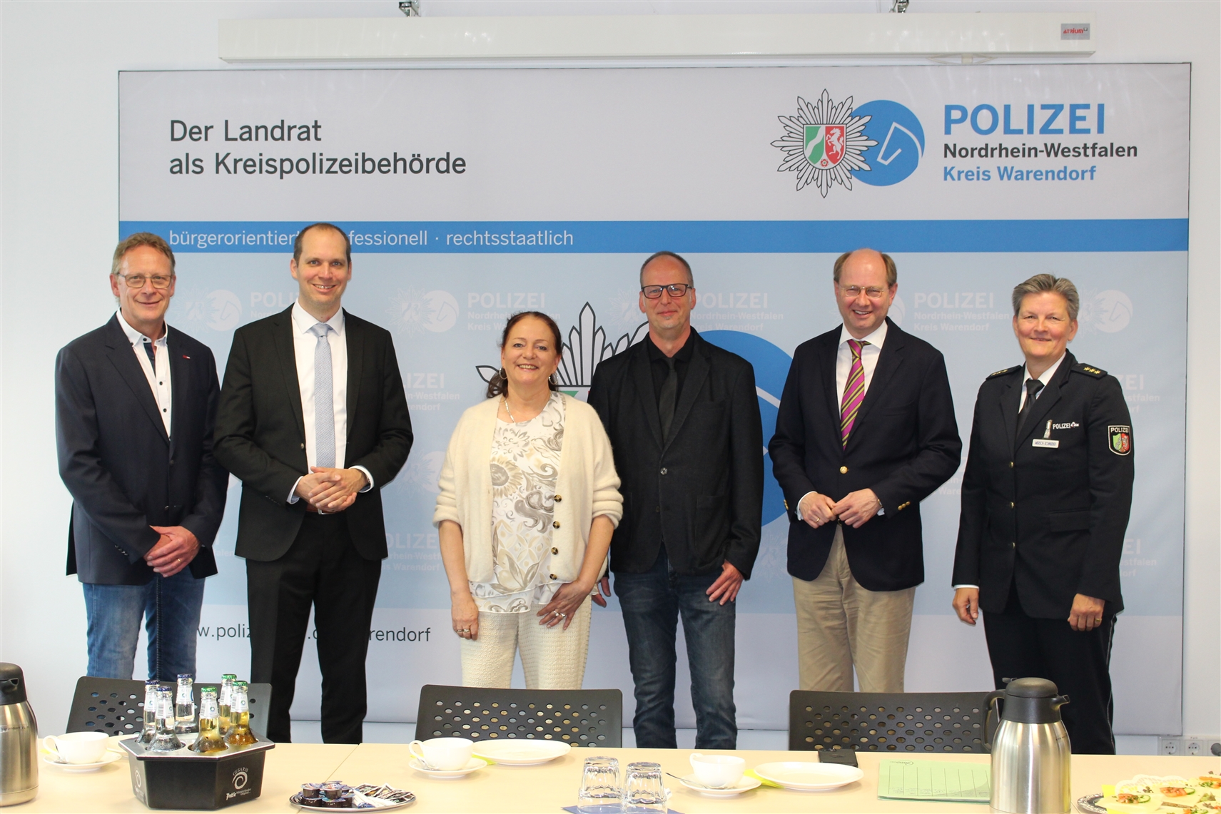 Abschied nahmen drei Polizisten der Kreispolizeibehörde Warendorf, für die ab dem 1. Juni 2024 ein neuer Lebensabschnitt beginnt. Landrat Dr. Olaf Gericke bedankte sich bei Polizeihauptkommissar Achim Herfort, Kriminalhauptkommissar Frank Isenberg und Kriminalhauptkommissar Winfried Petermann für ihren Jahrzehnte langen Einsatz für die Sicherheit der Bürgerinnen und Bürger im Kreis.