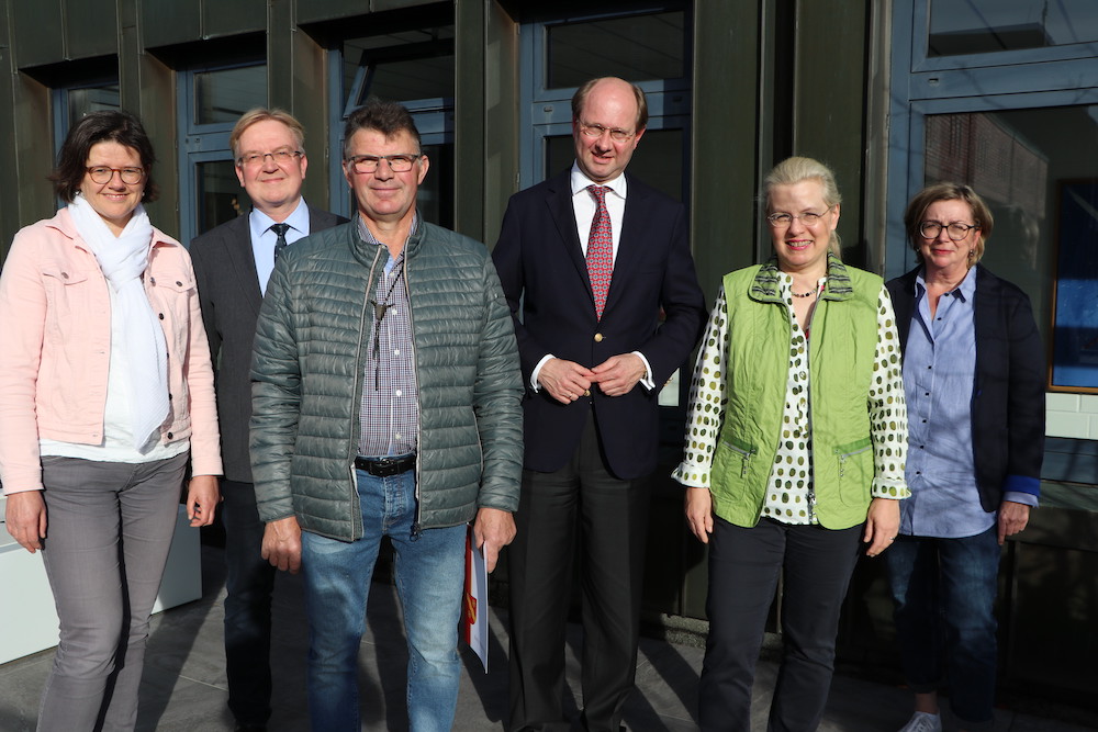 Sandra Kuhlbusch (v. l. Personalamt), Dr. Andreas Witte (Leiter Veterinär- und Lebensmittelüberwachungsamt), Felix Heseker, Landrat Dr. Olaf Gericke, Petra Schreier (Personaldezernentin) und Jutta Drilling-Kleihauer (Personalrat) bei der Verabschiedung im Kreishaus.