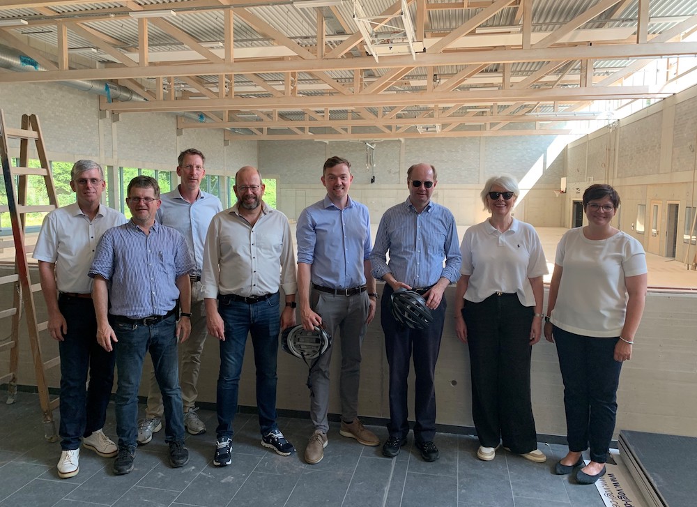 Den nächsten Stopp legte die Gruppe an der Grundschule ein. Dort entsteht gerade ein Erweiterungsbau, in dem die Offene Ganztagsschule untergebracht wird, sowie eine lichtdurchflutete Sporthalle. Rund 1.000 Quadratmeter Fläche stehen für Sportangebote zur Verfügung. Zudem können auch Veranstaltungen mit rund 400 Sitzplätzen in der Halle stattfinden.