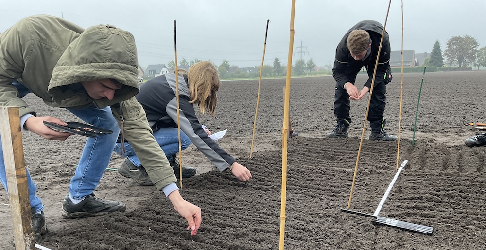 Auch in diesem Jahr stellt Landwirt Hans Hanhoff dem Paul-Spiegel-Berufskolleg einen Teil seiner Ackerfläche zur Verfügung, um der landwirtschaftlichen Unterstufe einen Anbauversuch zu ermöglichen. Die Schülerinnen und Schüler haben nun wenige Tage nach dem Landwirt eine Wintergerste der Sorte „Julia“ ausgesät. Dabei bewirtschaftet jede/r Auszubildende einen Quadratmeter Ackerfläche und entscheidet selbstständig über Bodenbearbeitung, Aussaattiefe, Aussaatstärke und Reihenabstand.