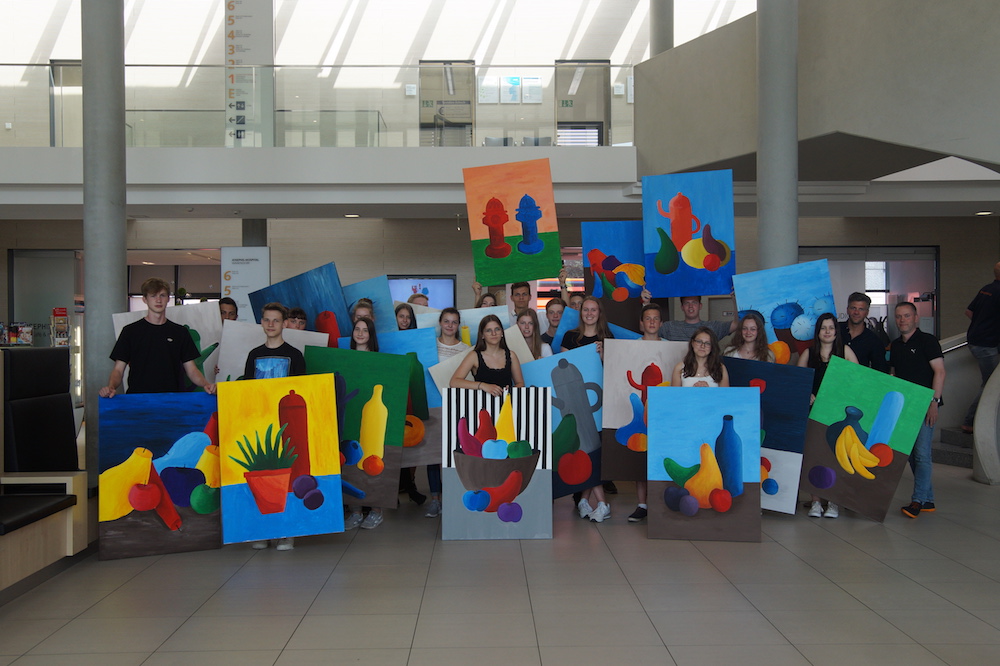 -arrangements unter inhaltlichen und ästhetischen Gesichtspunkten. Nicolas Party, ein in der Schweiz lebender Künstler, interpretiert den Begriff des Stilllebens nicht neu, arbeitet jedoch frei nach dem Prinzip der Formvereinfachung und den Gesetzen der Farbtheorie. In seinen abstrahierten Darstellungen nehmen beispielsweise Kakteen die Farbe Orange an, Pfirsiche werden blau, Baumkronen zeigen sich in strahlendem Violette und Sträucher leuchten gelb auf. Auch in den Schülerarbeiten der kunstbegeisterten Laurentianer, die sich in der kunstdidaktischen Analyse mit dem Traditionsbegriff des Stilllebens auseinandersetzten, finden sich klassische Kompositionsprinzipien wieder. Inspiriert durch die Analyse unterschiedlicher Werke Nicolas Partys, interpretierten die jungen Künstlerinnen und Künstler im Alter von 15-16 Jahren jeweils unterschiedliche Arbeiten Partys neu. Die Leinwände werden dem JHW als Dauerleihgabe zur Verfügung gestellt. Die Ausstellung weiterer Werke von nachfolgenden Kunstkursen des Gymnasium Laurentianum sind auch im kommenden Jahr fest eingeplant.