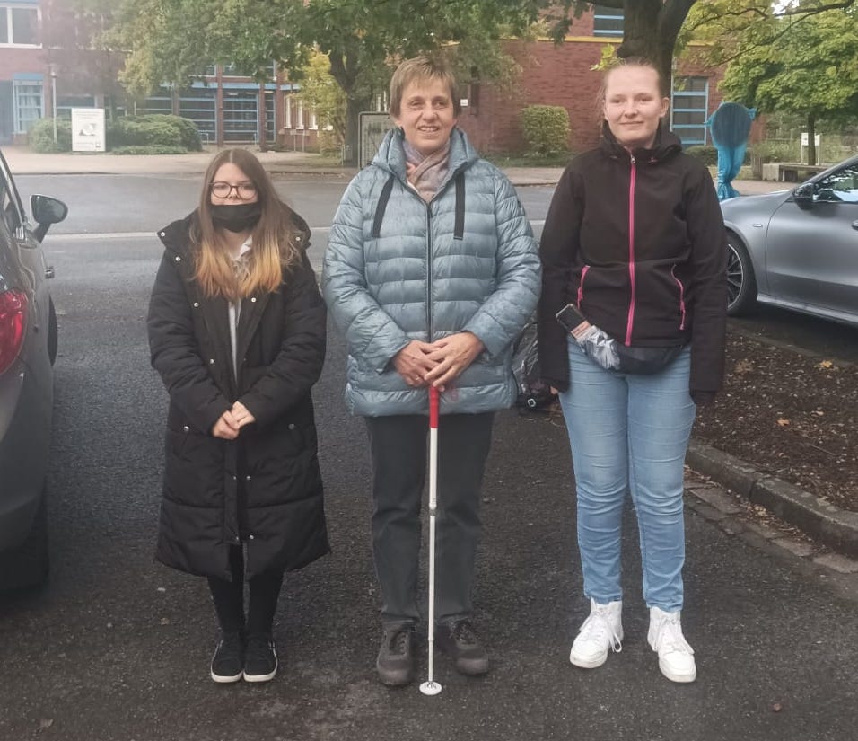 Im Fachpraxisunterricht Sozialpädagogik lernen die Schülerinnen und Schüler den Umgang mit sehbeeinträchtigten und blinden Menschen, indem sie beispielsweise mit verbundenen Augen Parcours bewältigen oder sich gegenseitig führen müssen. Im weiteren Verlauf des Schuljahres wird die Lerngruppe noch eine Einrichtung für Menschen mit Behinderung besuchen.