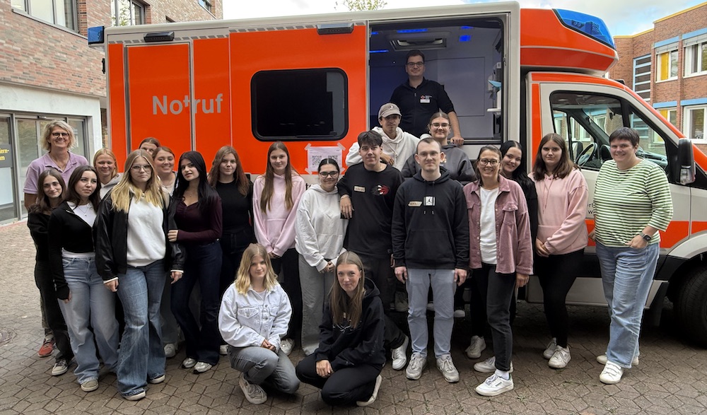 Die Klasse BFSO1 mit Henning Schulte von der DRK-Rettungsschule Warendorf (im Rettungswagen) und den Lehrerinnen Susanne Zinn (ganz li. hi.), Sabrina Grüter (4. v. re.) und Kristina Köhne-Ernst (ganz re.).