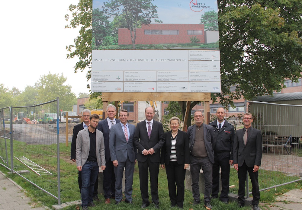 Kurz nach dem Start der Arbeiten besuchte Landrat Dr. Olaf Gericke mit Kreisdirektor Dr. Stefan Funke und Ordnungsdezernentin Petra Schreier die Baustelle. Architekt Helmut Riesenbeck und Rohbauunternehmer Hermann Schlüter informierten die Kreisspitze über den Stand der Arbeiten. Bei der Gelegenheit wurde auch das Baustellenschild aufgestellt.
