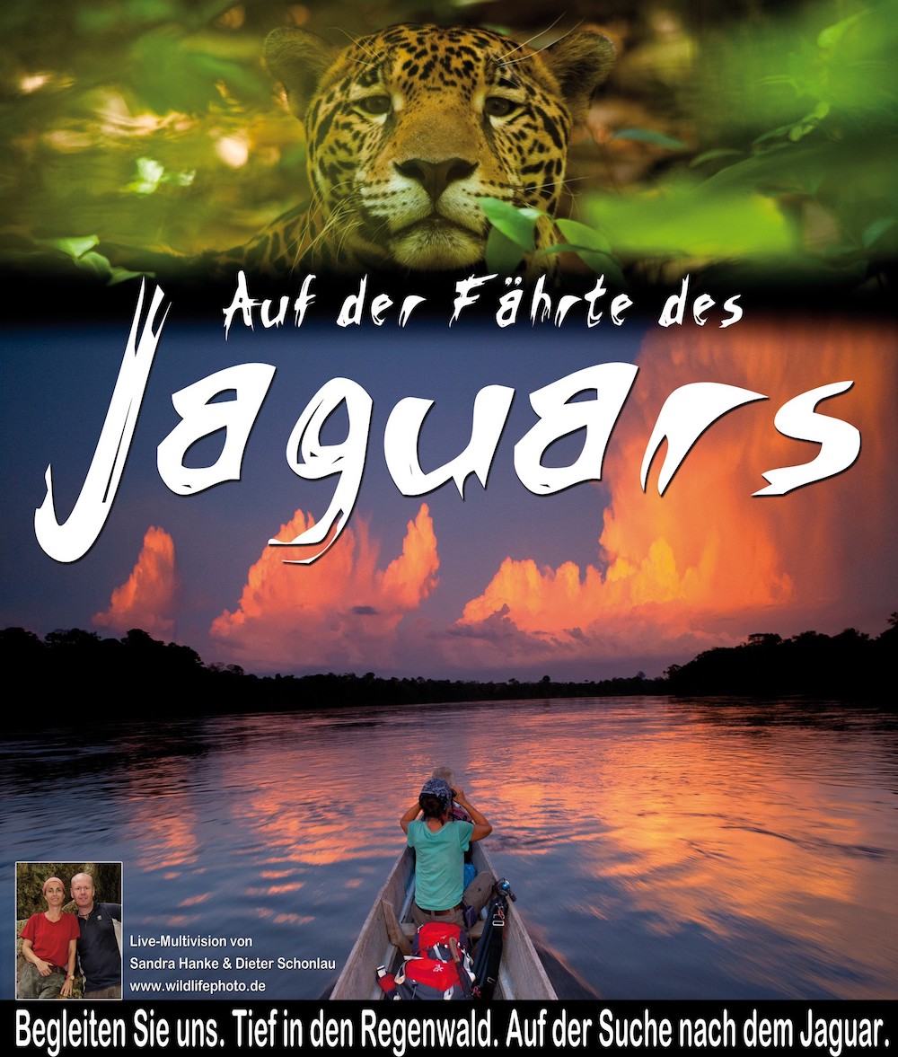 Wie uns dieses gelang, erleben Sie in unserer neuesten Live-Reportage „Auf der Fährte des Jaguars“. Sie ist eine abenteuerliche Dokumentation, für die wir viele Jahre die Wunderwelt der letzten noch intakten Regenwälder durchstreiften. Die Komposition aus spektakulären Fotografien, spannenden Erlebnissen und einer beeindruckenden Geräuschkulisse, machen diese Präsentation zu einem unvergesslichen Erlebnis.