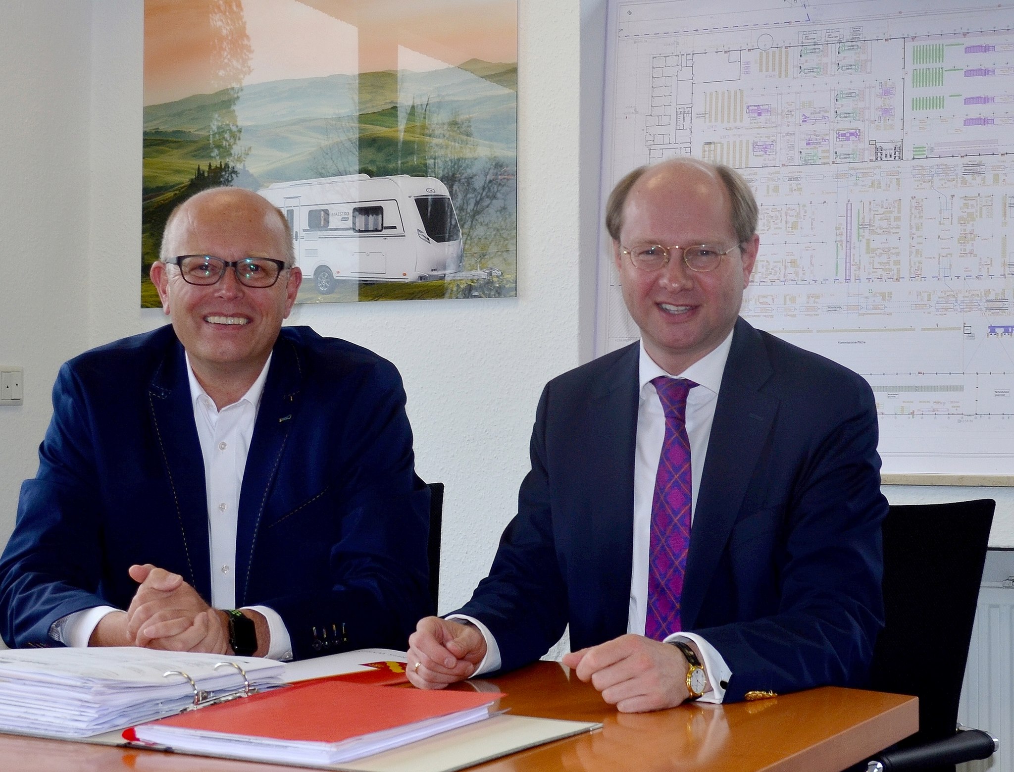 Die Erweiterung der LMC Caravan GmbH & Co. KG kann weiter voran gehen. Das Sassenberger Unternehmen hat jetzt grünes Licht vom Kreis Warendorf bekommen. Landrat Dr. Olaf Gericke konnte Geschäftsführer Ulrich Schoppmann die abschließende Baugenehmigung überreichen. „Der Kreis und die Stadt haben das Bauvorhaben konstruktiv und zügig bearbeitet. Das ist ein Grund, warum wir mit der Erweiterung im Zeitplan liegen“, sagte Schoppmann, der sich über den zügigen Fortschritt der Arbeiten freut.