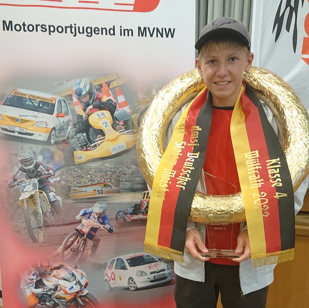 Als dreimaliger NRW Meister trat Louis Stange im Starterfeld der Klasse 4 der Vierzehn- und Fünfzehnjährigen gegen 32 Pilotinnen und Piloten aus ganz Deutschland an. Den ersten Tag beendete er als Schnellster mit Zweizehntelsekunden Vorsprung. Diesen ersten Platz galt es in den ausstehenden Läufen am Sonntag bei wechselnden Wetterverhältnissen auf Regenreifen zu verteidigen. Louis Stange setzte sich schließlich als letzter Starter im vierten und abschließenden Lauf in einem hochspannenden und teilweise dramatischen Rennen mit drei Hundertstelsekunden gegen den Zweitplatzierten aus dem Saarland durch. Er krönte damit seine bisherigen Erfolge und bescherte dem AC Warendorf den Deutschen Meistertitel im Jugend Kart Slalom. Ebenfalls in der Klasse 4 sorgte Elias Jovanovski als NRW Vizemeister mit seinem sechsten Platz für eine Komplettierung des hervorragenden Ergebnisses für den AC Warendorf. Auch er konnte damit fehlerfrei und nervenstark unter Beweis stellen, warum er zum wiederholten Mal zu den Top Ten im Teilnehmerfeld der Deutschen Meisterschaft zählte.
