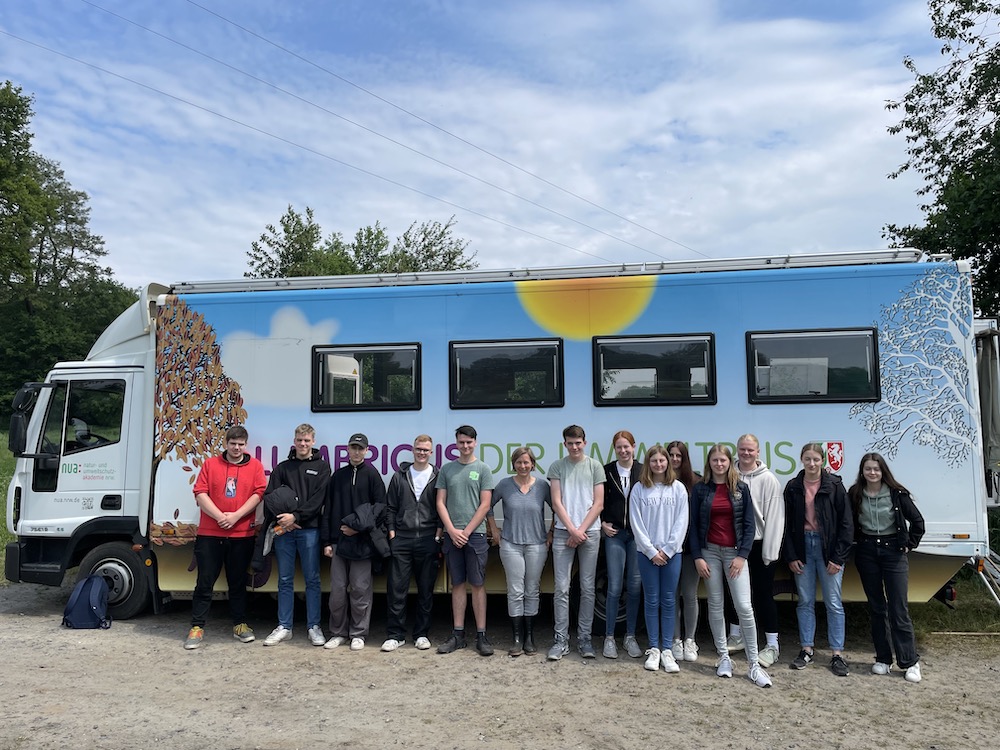 Am 07.06.2023, kurz vor den Sommerferien, rollte der Umweltbus von der Natur- und Umweltschutz-Akademie NRW (NUA) mit Regina von Oldenburg, der Umweltpädagogin der NUA, nach Milte zur ökologischen Freilanduntersuchung des lokalen Fließgewässers „Hessel“. Für die SchülerInnen des Biologie Leistungskurses von Frau Dr. Siemer so kurz vor den Sommerferien eine sehr lohnenswerter Praxistag, denn eingekleidet in Gummistiefel und z. T. auch in Anglerhosen ging es arbeitsteilig auf eine „Strukturanalyse“, eine „chemische Untersuchung“ sowie auf die Suche nach wirbellosen Bewohnern des kleinen Flusses. Bei leichtem Nieselwetter wurde gemessen, gezeichnet und fleißig gesammelt. Chemische Experimente wurden angesetzt und Steine zur Tiersuche im Fluss gedreht. Alle Gruppen konnten nach der ersten Arbeitsphase im Umweltbus eigene weitere Analysen durchführen, präsentieren und die Ergebnisse der anderen bestaunen. Hierbei erstellten die SchülerInnen auch einen kleinen Tierfilm mit ihren Bestimmungsergebnissen.