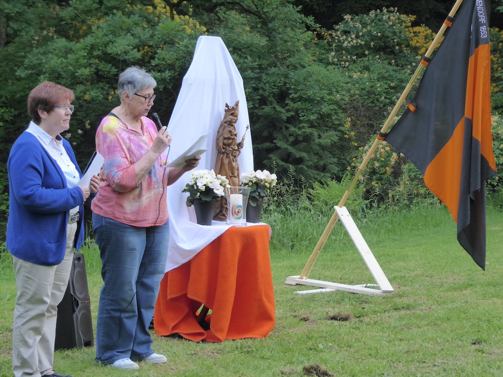 Anne Löhrs und Maria Wagner haben die Andacht vorbereitet und dazu verschiedene Gedanken vorgetragen. Im 18. Jahrhundert ist der Brauch der Maiandachten in Italien entstanden und nach Norden gewandert. Der Mai ist zu einem Monat besonderer Verehrung für die allerseligste Jungfrau ausersehen worden. Die Erde schmückt sich mit frischem Grün und Laubwerk, die Bäume blühen und in den Gärten stehen die Blumen. Diese Freude und Froheit der äußeren Natur ist der rechte Rahmen für unsere Andacht die hier in der herrlich Bunt leuchtenden Parkanlage und mit der untergehenden Abendsonne stattfinden kann. Auch wurden zwischen den verschiedenen inhaltlichen Beiträgen einige Marienlieder gesungen.