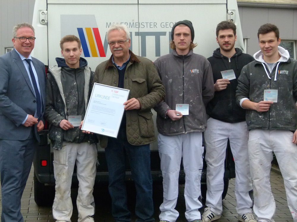 Die Qualität der Ausbildung stimmt im Malerbetrieb von Georg Witte in Warendorf. Das hat das Innungsunternehmen der Maler- und Lackieer-Innung nun auch schwarz auf weiß. Denn die Kreishandwerkerschaft Steinfurt-Warendorf (KH) hat das Unternehmen als „TOP-Ausbildungsbetrieb“ ausgezeichnet. KH-Hauptgeschäftsführer Frank Tischner überreichte die entsprechende Urkunde an den Firmeninhaber, Maler- und Lackierermeister Georg Witte. Der Malerbetrieb ist das erste Unternehmen im Kreis Warendorf, das die Auszeichnung der Kreishandwerkerschaft Steinfurt-Warendorf erhält.