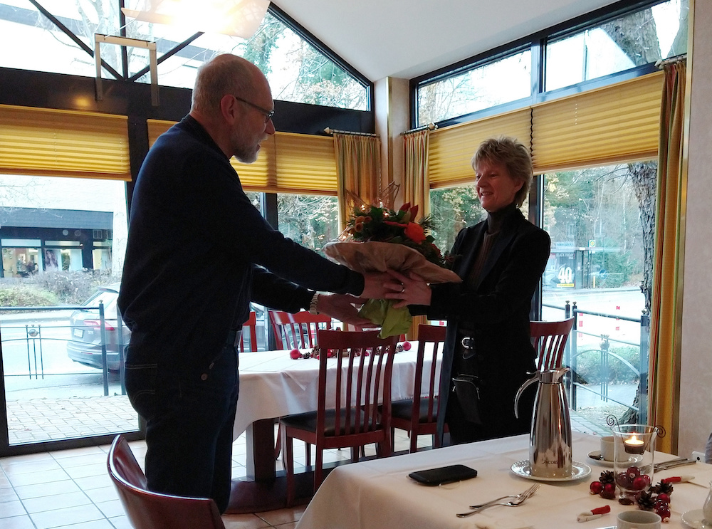 Michael Reher, Martina Mersch bei der Übergabe des Blumenstraußes