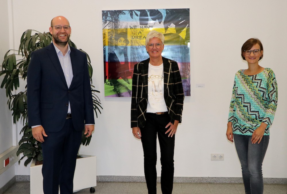 Jobcenterleiter Dr. Ansgar Seidel, Sozialdezernentin Brigitte Klausmeier und Jobcentermitarbeiterin Aurelia Wellenkötter hoffen auf zahlreiche Einsendungen beim Malwettbewerb für leistungsberechtigte Kinder und Jugendliche zwischen 3 und 17 Jahren. – Foto: Kreis Warendorf