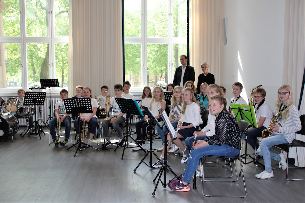 Münster. Warendorf. Am 23. April wurden in den Räumen der Bezirksregierung Münster 26 Lehrerinnen und Lehrer für ihren 40-jährigen Schuldienst von Regierungspräsidentin Dorothee Feller geehrt. Mit dabei: Die Bläserklasse des MGW. Für ihr erstes Engagement war die Klasse gemeinsam mit ihrem Musiklehrer nach Münster gefahren. Gäste, Lehrer und die Regierungspräsidentin staunten nicht schlecht, als sie den lichtdurchfluteten Raum betraten: 20 Schülerinnen und Schüler spielten unter der Anleitung ihres Lehrers Peter Behrens für sie auf. Saxophon, Tuba, Querflöte, Oboe und weitere Blasinstrumente sowie das taktgebende Schlagzeug hatten die Kinder der 6B fest im Griff. Auch von der etwas speziellen Akustik in dem historischen Gebäude ließ sich die Bläserklasse nicht irritieren. Und so waren Gäste und die Regierungspräsidentin gleichermaßen beeindruckt, als Peter Behrens erklärte, dass alle Schüler ihre Instrumente erst seit rund anderthalb Jahren erlernen. Zudem von Anfang an auch im Orchester. Eine große Herausforderung für Kinder und den Musiklehrer. „Ich bin überaus zufrieden mit dem, was die Schüler hier schon auf die Beine stellen. Und diese Erfolge geben den Kindern auch Motivation und Selbstbewusstsein für andere Schulfächer“, erklärt Peter Behrens.