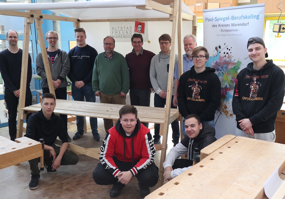 Die Schüler der einjährigen Berufsfachschule Holztechnik des Paul-Spiegel-Berufskollegs bauen Marktstände für den Hansetag am 18. und 19. Mai in Warendorf. Die Idee zu dem Projekt ging von den Altstadtfreunden Warendorf e.V. aus. Alfred G. Smieszchala als stellvertrender Vorsitzender und Techniker für Baudenkmalpflege stellte die Anfrage an die Holzabteilung des Berufskollegs. Schnell stand nach einem ersten Treffen fest, dass die Berufsfachschule Holztechnik die Umsetzung übernimmt. Die Schüler der Klasse zeichneten zunächst den Marktstand am Computer, anschließend ging es zur Fertigung in die Werkstatt. Die Marktstände sollen langfristig genutzt werden, d.h. nicht nur den Hansetag verschönern, sondern auch auf anderen Märkten zum Einsatz kommen und damit die Altstadt beleben. Auch für Vereine sollen die Stände ausleihbar sein. Die Finanzierung erfolgte über den sogenannten Altstadtfond. Dieser ist Bestandteil des Stadtentwicklungsprozesses in der Altstadt. Ziel des Fonds ist es, die Warendorfer Altstadt als attraktiven Wohn-, Lebens- und Arbeitsstandort zu stärken.