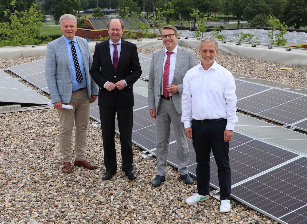 Die große PV-Anlage auf dem Dach des Paul-Spiegel-Berufskollegs nahmen (v.l.) Amtsleiter Hendrik Borgstedt, Landrat Dr. Olaf Gericke, Kreisdirektor Dr. Stefan Funke und Schulleiter Udo Lakemper in Augenschein. – Foto: Kreis Warendorf