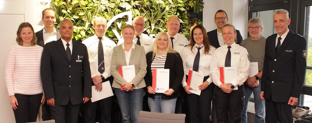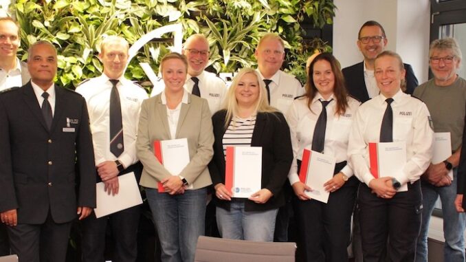 Auf dem Gruppenfoto v.l.n.r. zu sehen: Leiterin Zentrale Aufgaben Stefanie Altrogge, Leiter Direktion Kriminalität Timo Päßler, Stellvertretender Abteilungsleiter Polizei Johannes Schütze, Polizeihauptkommissar Bernd Kaupmann, Kriminalhauptkommissarin Monique Krude, Polizeihauptkommissar Norbert Klare, Kriminalhauptkommissarin Sarah Wolf, Polizeioberkommissar Stefan Wellmann, Polizeihauptkommissarin Eva-Maria Kapellari, Polizeioberkommissar Carsten Noldes, Polizeihauptkommissarin Anne Beckervordersandforth, Regierungsbeschäftigter Arthur Hälker, Personalratsvorsitzender Martin Entrup.