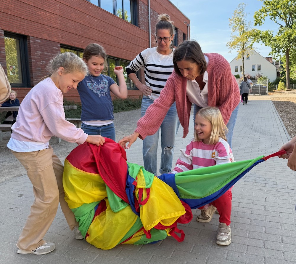 Das macht Spaß! Ella Eichler genießt es, mit dem Schwungtuch durch die Luft gewirbelt zu werden. OGS-Kraft Michaela Hoveling und Ellas Schwester Lina halten das Tuch.
