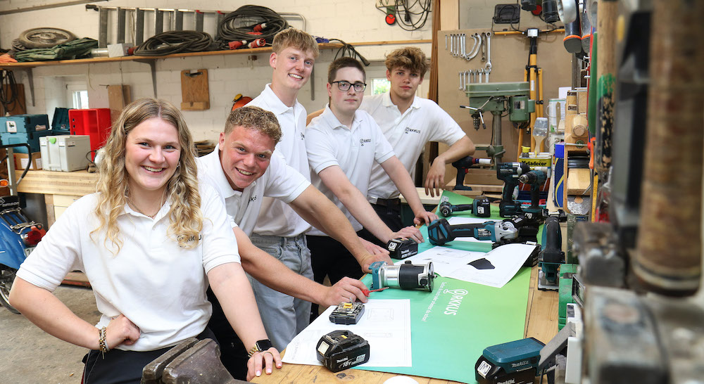 „Team Orkkus“, das sind Lucy Fellhölter aus Sassenberg, Mattis Hilgenhöner aus Drensteinfurt-Rinkerode und Finn Tilbeck aus Telgte sowie Benedikt Ueding aus Laer-Holthausen und Leonard Kaltmeyer aus Münster-Coerde. Sie schafften es mit einem starken 16. Platz ins Halbfinale von „Jugend gründet“. Insgesamt waren fast 1.200 Geschäftsideen von Schülerinnen und Schülern eingegangen. Doch im März, beim Pitch-Wettbewerb im Bildungszentrum der IHK in Münster, reichte es nicht für den Einzug ins Finale. „Niedergeschlagen“ war das Team, blickt Tilbeck zurück, ans Aufgeben dachte aber niemand. Denn viele Unternehmer aus dem Bekanntenkreis fanden die Idee gut, weil sie das Problem kennen: Ausgerechnet dann, wenn ein voller Akku gebraucht wird, ist dieser oft unauffindbar. Die App „Orkkus“ soll deshalb das Smartphone mit einem Trackingchip im Akku verbinden, den Stromspeicher orten und dessen Ladestand melden. Lässt mitten in der Arbeit die Leistung eines Akkus nach, ist vollgeladener Ersatz schnell gefunden. „Suchst du noch oder arbeitest du schon?“ lautet das Motto von Orkkus.
