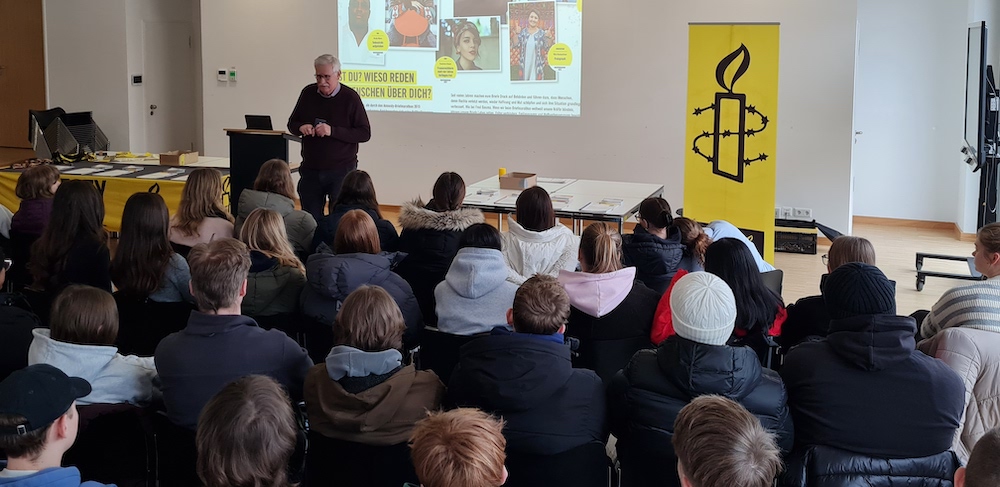 „Es braucht einen langen Atem, aber es lohnt sich.“ – mit diesen Worten warb Konrad Schoppmann von der Warendorfer Gruppe Amnesty International (AI) bei einer Veranstaltung am Paul-Spiegel-Berufskolleg für den Briefmarathon, der von der größten Menschenrechtsorganisation der Welt jährlich durchgeführt wird. Viele Schülerinnen und Schüler haben die Gelegenheit genutzt, sich zu informieren über den Ablauf der Hilfsaktion, bei der man durch das Schreiben an Regierungen und Behörden dabei mithelfen kann, dass Unrecht beendet wird. Mit der „Waffe Kugelschreiber“, so Konrad Schoppmann, werde Druck aufgebaut, ganz ohne Gewaltanwendung. Ein einzelner Brief könne noch ignoriert werden, hunderttausende aber nicht. Die Schülerinnen und Schüler erfuhren von Fällen, in denen die Kampagne dazu beigetragen habe, Menschenleben zu retten, Gefangene freizulassen oder Anklagen zurückzuziehen. Auch Karten an die Betroffenen selber zu schreiben, damit sie sich nicht vergessen und ermutigt fühlen, ist eine Möglichkeit der Unterstützung. Jeder Fall werde von AI vorab sorgfältig auf Glaubwürdigkeit geprüft. Acht aktuelle Beispiele für Hilfe-Aufrufe, die Konrad Schoppmann genauer vorstellte, zeigten die Bandbreite der Themen und Schicksale, für die sich Amnesty International einsetzt. Die kritische Situation der Menschen im Iran wurde ebenfalls angesprochen. Die Schülerinnen und Schüler waren erkennbar berührt und stellten im Nachgespräch noch viele Fragen, bei denen es auch um die Klärung von möglichen Risiken bei der Teilnahme am Briefmarathon ging. Wer sich entscheiden konnte und wollte, unterzeichnete noch vor Ort die vorgefertigten Briefvorlagen oder formulierte persönliche, mutmachende Botschaften. Insgesamt sind 308 Unterschriften zusammengekommen. Und hier noch ein Nachtrag: Amnesty International hat sich im vergangenen Jahr mit einer Urkunde für die Beteiligung des Paul-Spiegel-Berufskollegs am Briefmarathon 2024 bedankt.