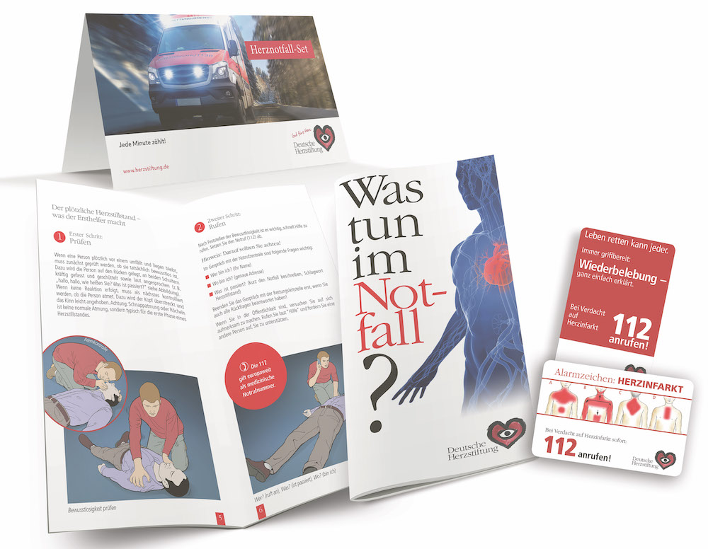 Ein Notfallset mit dem Ratgeber „Was tun im Notfall?“ (14 Seiten) und 2 Notfallkärtchen fürs Portemonnaie mit Darstellungen der Herzinfarkt-Alarmzeichen und Erläuterungen zur Wiederbelebung für Laien bietet die Herzstiftung kostenfrei unter Tel. 069 955128400 oder unter www.herzstiftung.de/herznotfall-set.html an.