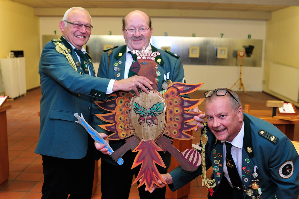 Unterdessen wurde es im Kleinkalieberstand musikalisch, denn Theo Geers kam etwas verspätet zum Schießen, brachte aber sein Akkordeon mit um das Schießen etwas zu untermalen. Als Theo Geers dann an der Reihe war auf den Adler zu schießen, waren bereits 124 Schuss abgegeben worden. Er ging zum Schießsportleiter Kurt Scholz und ließ sich alles kurz erklären. Stellte dann aber fest das er mit Rechts nichts sieht und stellte sich anders zum Gewehr um nun mit Links zu zielen. Das Gewehr wurde geladen und schnell fiel der Schuss, doch damit nicht nur der Schuss, sondern auch die Kinnladen, denn mit dem 125. Schuss fiel auch der Königsadler. Es mochte keiner glauben aber alle waren hoch erfreut, das Theo Geers nun neuer „König der Könige“ ist.