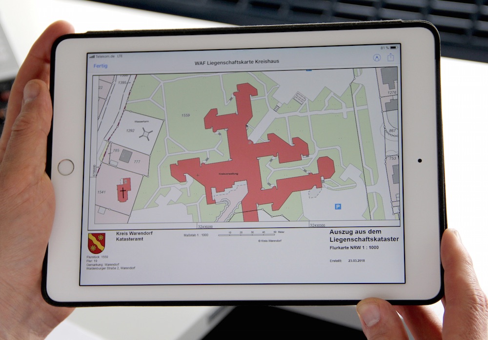 Seine Angebote im Bereich der digitalen Dienstleistungen weitet der Kreis Warendorf jetzt aus. Wer zum Beispiel eine amtliche Liegenschaftskarte benötigt, kann das Kartenblatt schnell und einfach online ordern – und auch gleich bezahlen. „Mit diesem neuen Angebot sind wir bundesweit vorne bei den Verwaltungen“, sagt Kreisdirektor und Kämmerer Dr. Stefan Funke, der für die Digitalisierung der Verwaltung verantwortlich ist.