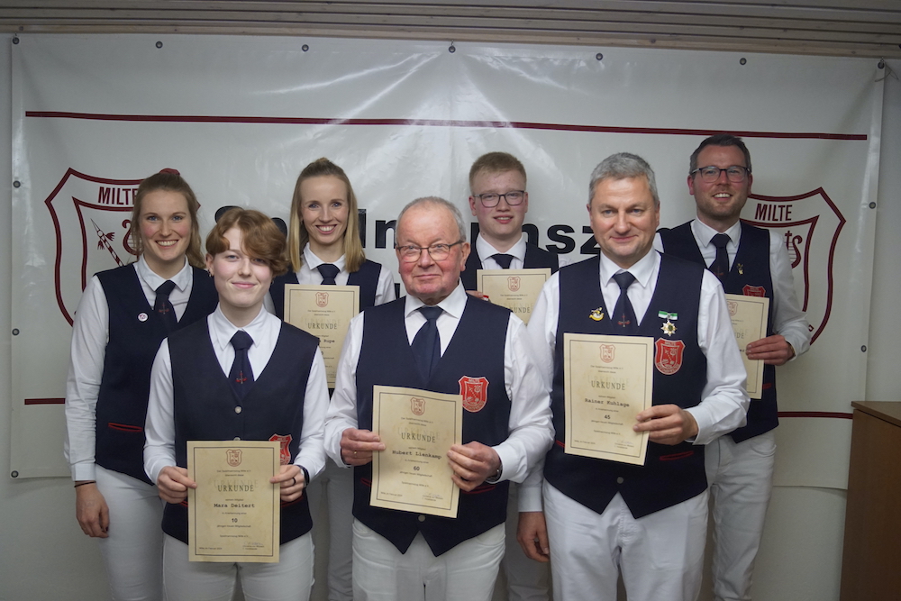 Für zehnjährige Mitgliedschaft geehrt wurden Lilly Burbank, Mara Deitert, Luca Everwin, Merle Gröne, Lea Schlüppmann und Lukas Uschkamp. Linda Rupe gehört dem Verein seit 20 Jahren an und der Tambourmajor Matthias Danwerth zählt mittlerweile 25 Jahre. Weiter bekam Rainer Kuhlage eine Ehrung für 45 Jahre und dem konnte sein Onkel Hubert Lienkamp mit unglaublichen 60 Jahren oben noch einen drauf setzen. Rainer erzählte bei seiner Ehrung, dass er es sogar Hubert zu verdanken hatte, dass er überhaupt im Spielmannszug aufgenommen wurde, umso schöner ist die gemeinsame Würdigung nach so vielen Jahren.