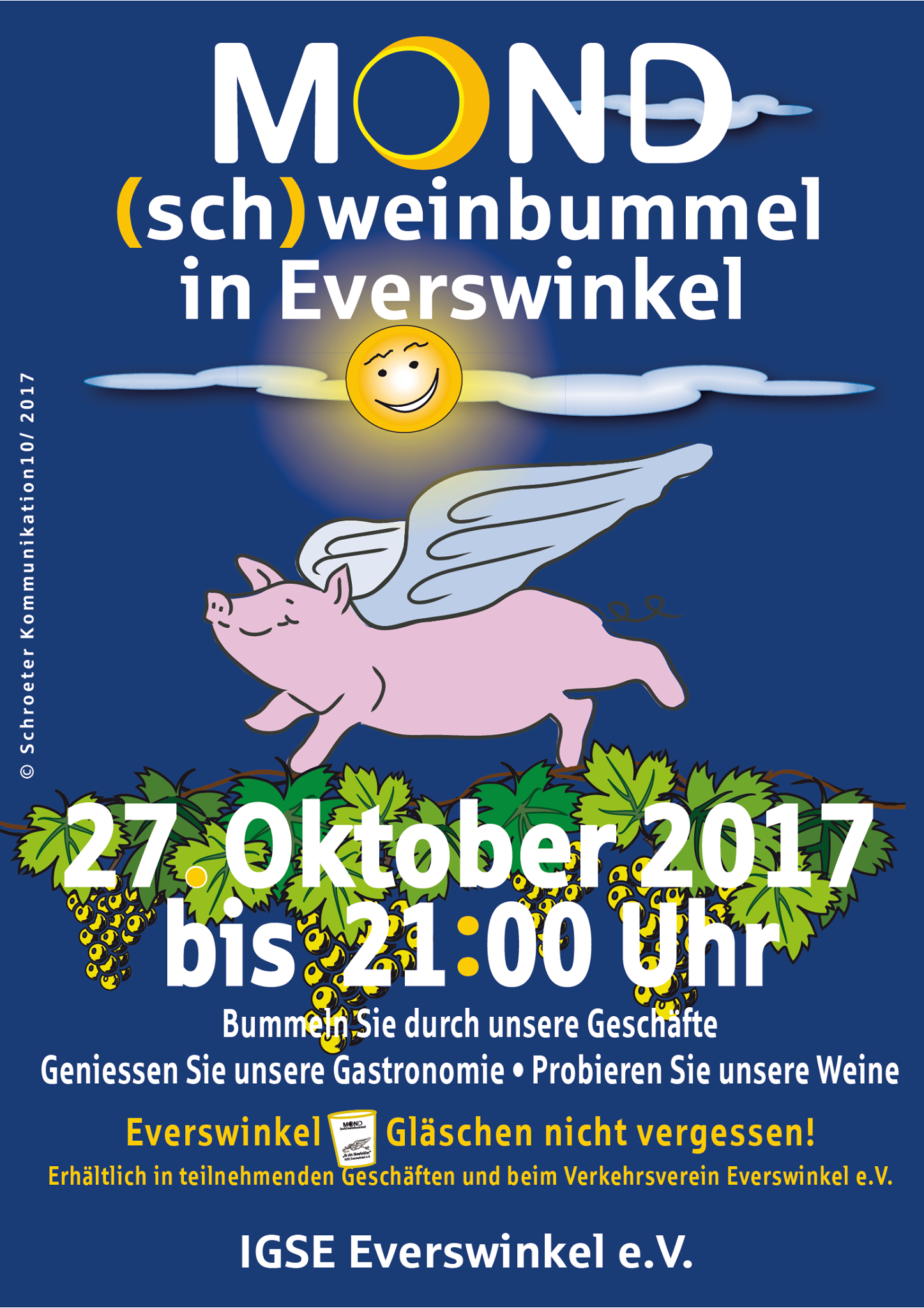 Hugo Schröter hat auch für die dritte Ausgabe des Mond(sch)weinbummels ein besonderes Motiv-Gläschen entworfen, das in diesem Jahr ein weinselig fliegendes Schwein zeigt. Die Gläser dienen wie immer als Probiergläser auf der Weinreise durch Everswinkel und können für 3,-€ beim Verkehrsverein Everswinkel e.V., sowie den teilnehmenden Geschäften erworben werden.