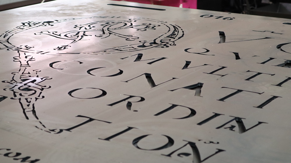 Das Foto zeigt eine Stahlplatte mit Auszügen aus dem Evangeliar gelasert, die den neu gestalteten Ausstellungsraum des 1000 Jahre alten Kirchenbuches bilden.