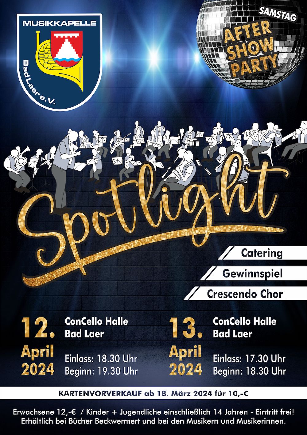 Im April steht Bad Laer ganz im Zeichen der Blasmusik, denn wir, die Musikkapelle Bad Laer, geben ein Konzert der Extraklasse. Unter dem Motto „Spotlight“ werdet ihr mit mitreißenden Klängen und beeindruckenden musikalischen Darbietungen begeistert.