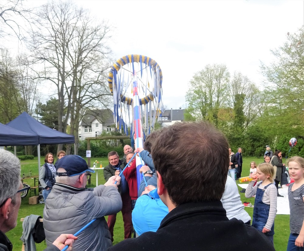 Die Nachbarn im Wohngebiet Düsternstr./Diekamp halten bei all ihren Aktionen fest zusammen. So zogen sie nun auch mit vereinten Kräften den Maibaum in die Höhe. Und diese waren zahlreich vor Ort, auf dem Bolzplatz hinter dem Alten Lehrerseminar. An die 100 Besucher genossen nach dem kräftezehrenden Akt geistige Getränke und leckere Bratwürstchen; letztere wie immer serviert vom Nachbarehepaar Thomas und Karla Stephan.
