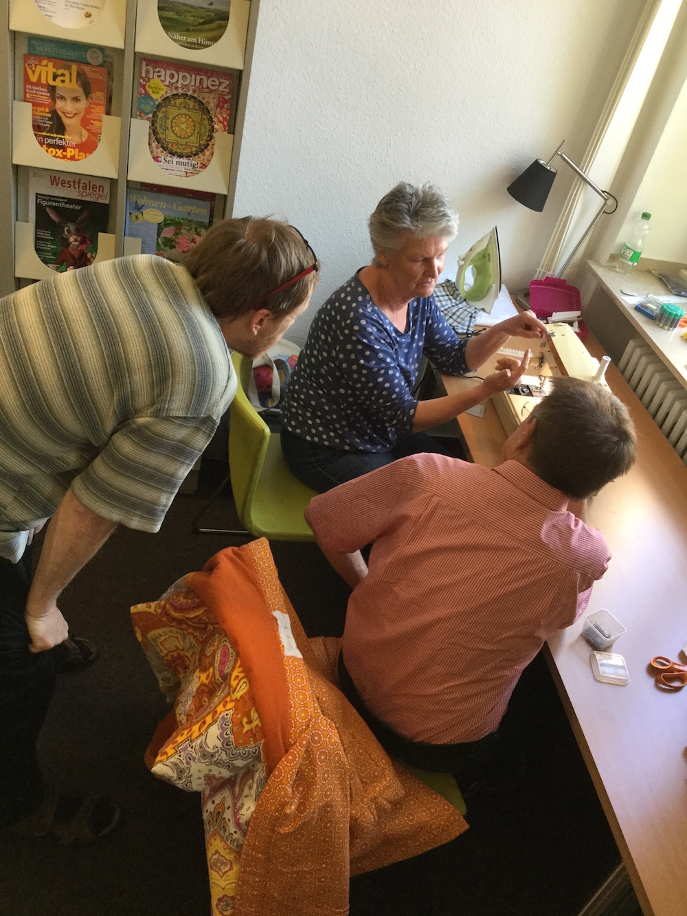 Einige Werkzeugkoffer, eine Nähmaschine, ein paar Tische mehr – schnell war das Lesecafé im Erdgeschoss umfunktioniert zur ersten „Näh- und Reparaturwerkstatt für Selbermacher“. Und die ersten Aufträge waren auch schnell da: eine Hose mit zu langen Beinen; ein vom Kuscheln kaputtes Stoffhäschen; und ein Tablet mit totem Display, das aber noch Geräusche machte und doch noch nicht ganz tot zu sein schien.