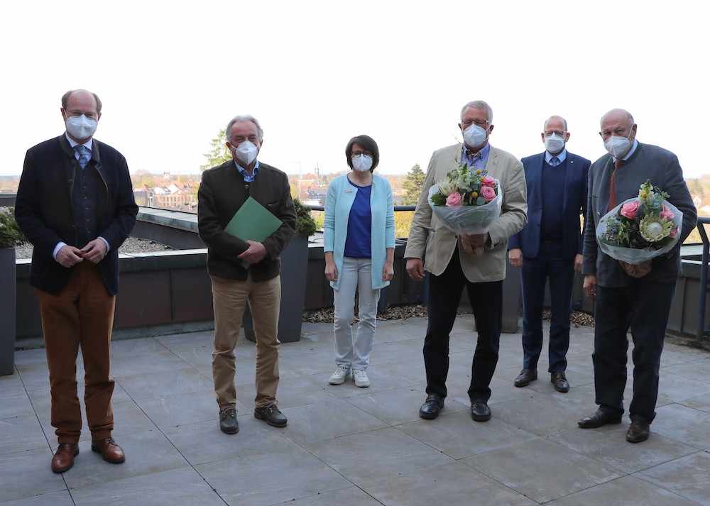 Bei der konstituierenden Sitzung des Naturschutzbeirats wurde Georg Graf von Spee (r.) als Vorsitzender verabschiedet. Neuer Vorsitzender ist Bernhard Kleibolde (3.v.r.), Franz Stockmann (2.v.l.) ist sein Stellvertreter. Landrat Dr. Olaf Gericke (l.), Umweltdezernent Dr. Herbert Bleicher (2.v.r.) und Daniela Puppe, Leiterin der Unteren Naturschutzbehörde (3.v.l.), gratulierten herzlich. – Foto: Kreis Warendorf