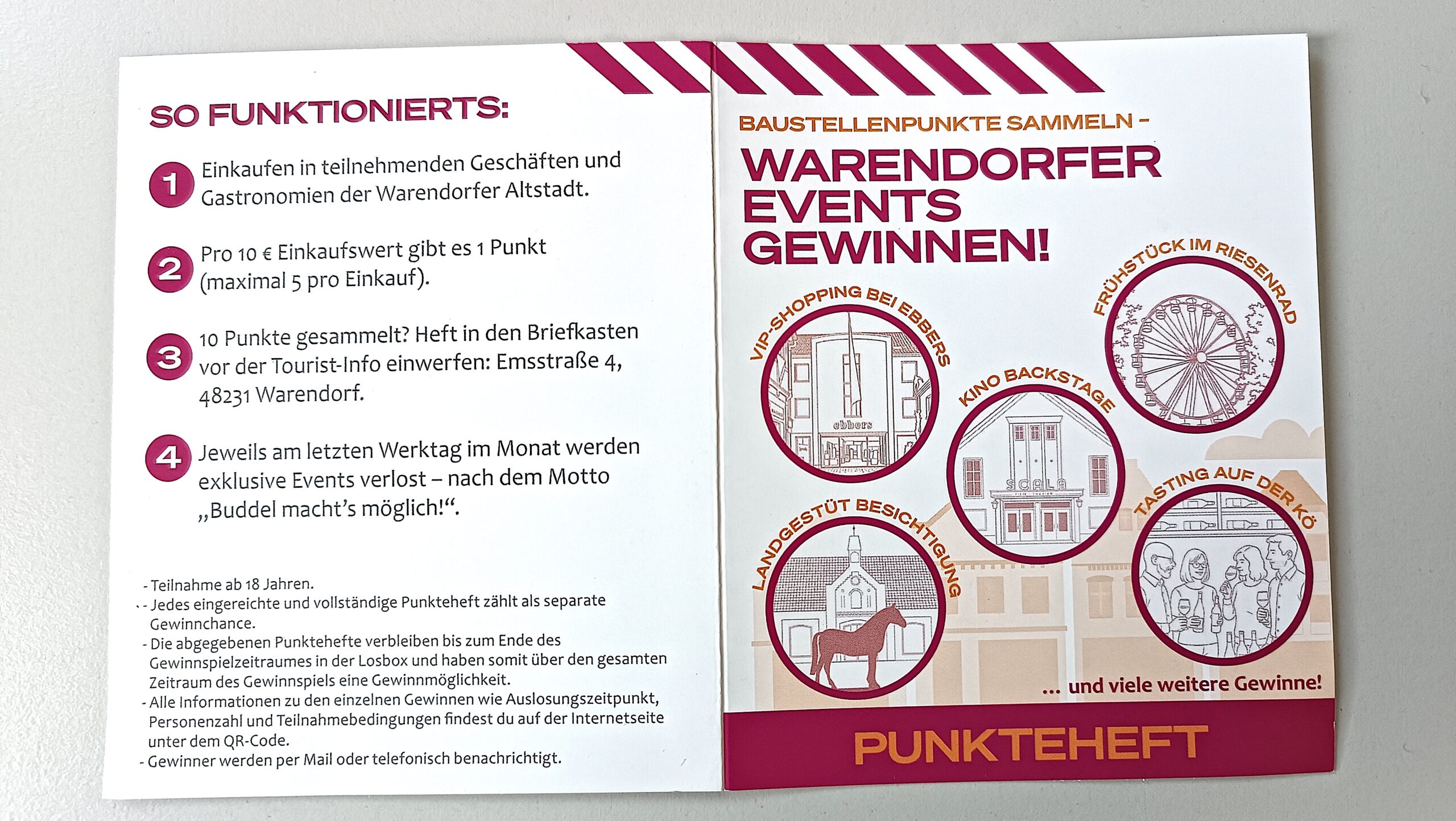Einkauf und Genuss in der Warendorfer Altstadt wird in der neuen Aktion belohnt: für je 10 € Einkauf in einem der über 30 teilnehmenden Geschäfte und Gastronomiebetriebe gibt es einen Baustellenpunkt, mit 10 Punkten ist die Teilnahme am Gewinnspiel möglich. Jeden Monat werden hier besondere Events verlost, die es so nicht zu kaufen gibt.