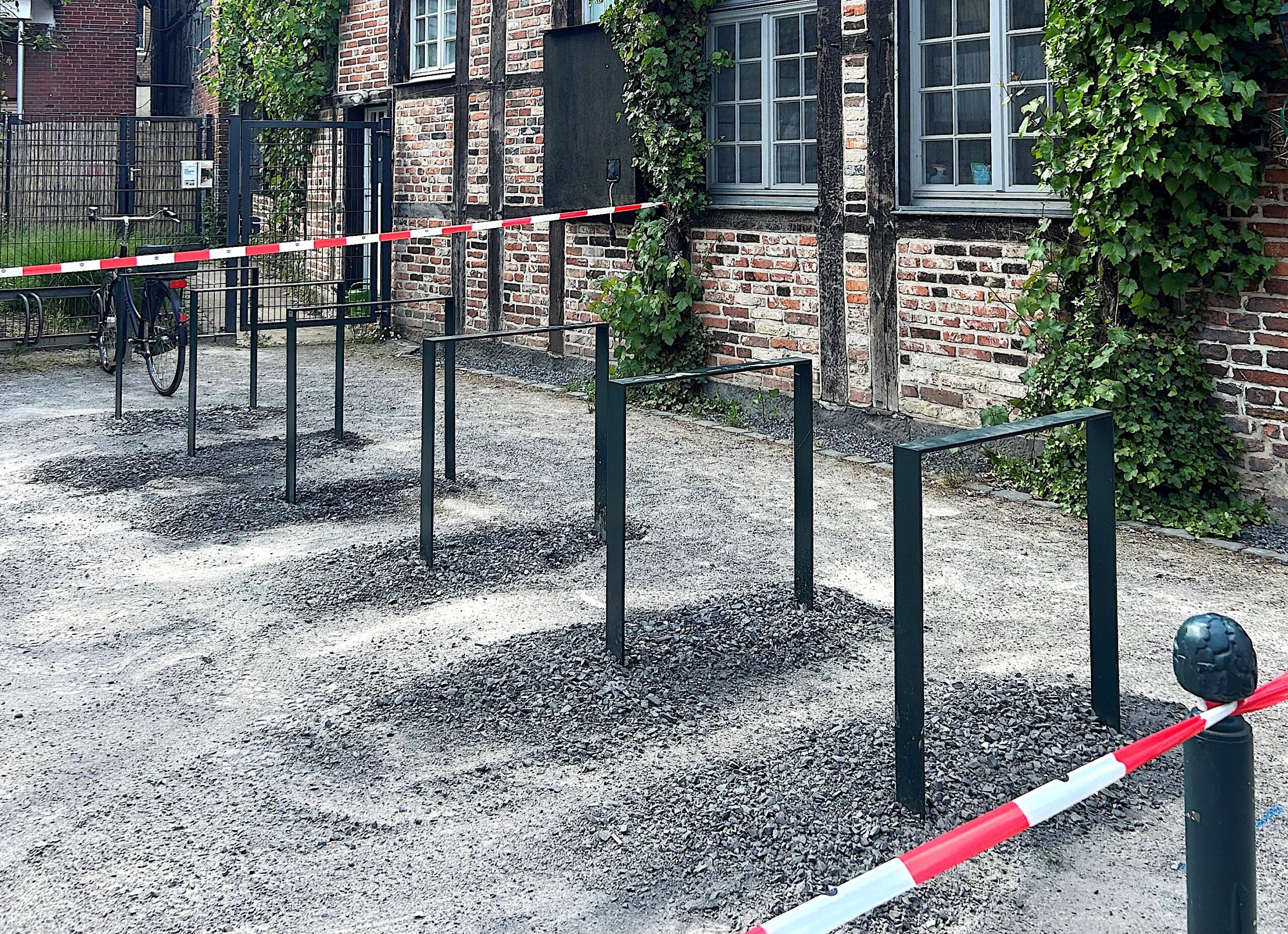 In der Emsstraße entstehen gerade neue Fahrradstellplätze. Der Baubetriebshof der Stadt Telgte hat jetzt sechs Anlehnbügel installiert. Sobald der Untergrund geglättet ist, sind diese frei verfügbar für alle Radlerinnen und Radler.