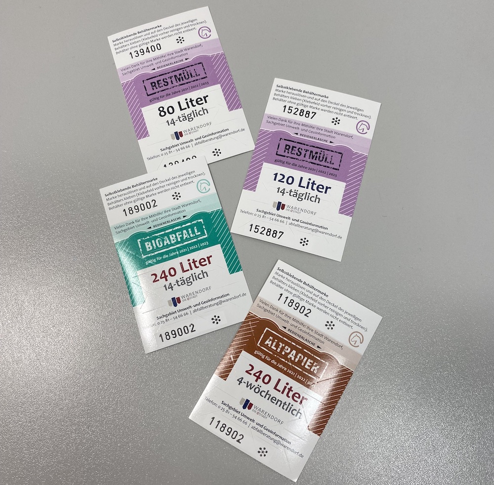 Noch sind alle Müllbehälter in Warendorf mit den Gebührenmarken aus den Jahren 2021/2022/2023 beklebt. Im März werden die neuen Behältermarken für die Jahre 2024/2025/2026 gedruckt und an alle Haushalte per Post verschickt. Bis dahin behalten die alten Behältermarken ihre Gültigkeit und die Tonnen werden selbstverständlich weiterhin geleert. Auch in diesem Jahr ausgelieferte Müllbehälter erhalten erst im März ihren neuen Aufkleber.