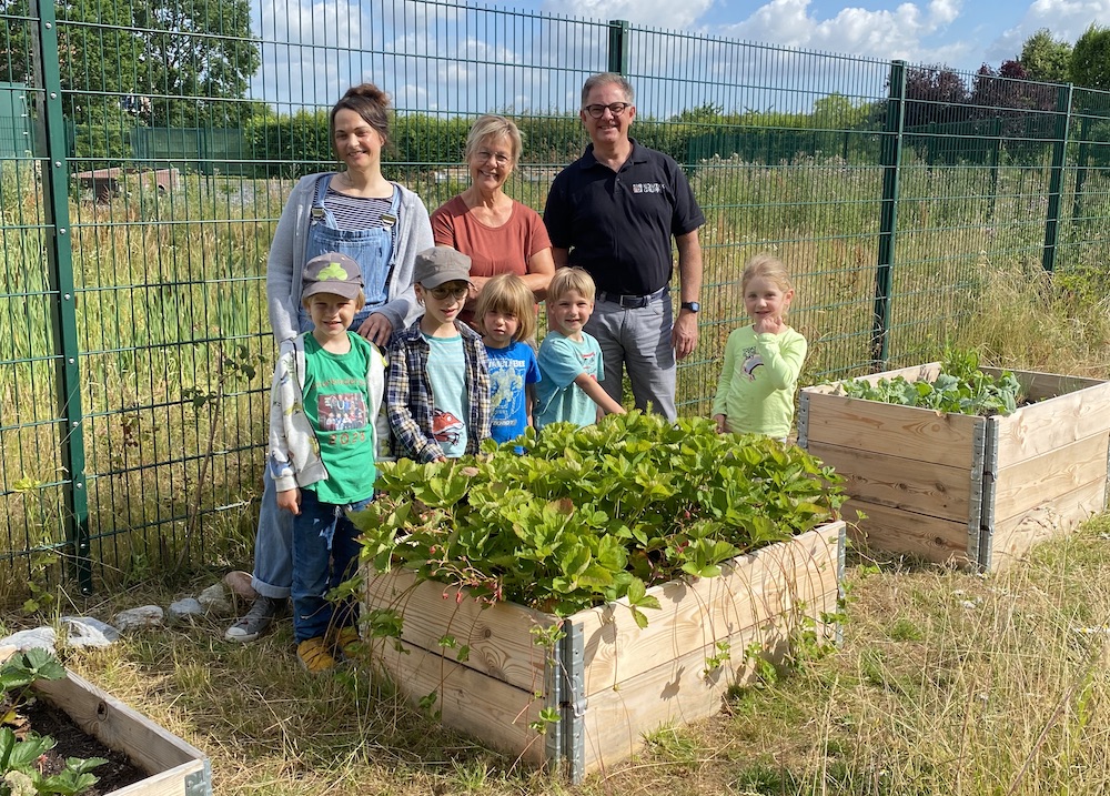 v. l. Inga Hoppe und Jutta Luhmeyer (Naturkindergarten), Thomas Krale (Geschäftsführer KOMTAX) und die Kindergartenkinder erfreuen sich über die drei neuen Hochbeete im neuangelegten Garten.