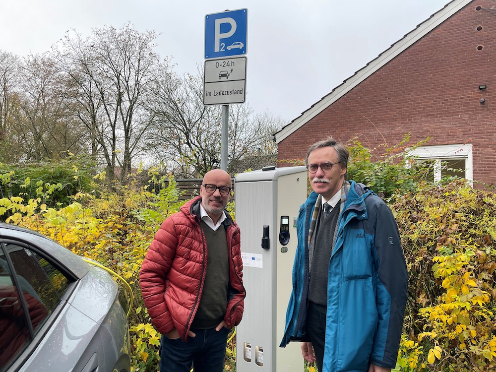 Michael Gennert (Direktor LVHS Freckenhorst) und Ulrich K. Butterschlot (Geschäftsführer Stadtwerke Warendorf) freuen sich, einen weiteren attraktiven Lade-Standort im Warendorfer Städtenetz geschaffen zu haben.