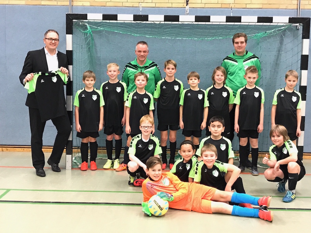 Die U10-Junioren des VfL Sassenberg freuten sich über einen neuen Trikotsatz. Dieser wurde von der Sparkasse Münsterland Ost gespendet. Nach dem Engagement der Sparkasse an den erfolgreich durchgeführten 46. Hallenturnieren des VfL-Sassenberg, unterstützt die Sparkasse die Jugendmannschaften des VfL auch weiterhin im Einzelnen. So ließ es sich der Leiter des Beratungscenters Sassenberg, Robert Weihrauch, nicht nehmen, beim Training der U10 in der Herxfeldhalle vorbeizuschauen. Hier präsentierten die Jungs stolz die neuen Trikots, und die beiden Trainer, Franz-Josef Laumann und Dominik Pfeffer, konnten Robert Weihrauch Danke für die Unterstützung sagen. Die VfL Fußballabteilung und der Förderverein bedanken sich ebenfalls für das Engagement der Sparkasse Münsterland Ost. Nun kann es für die U10 nach der Winterpause mit neuen Trikots weiter erfolgreich in die Rückrunde gehen.