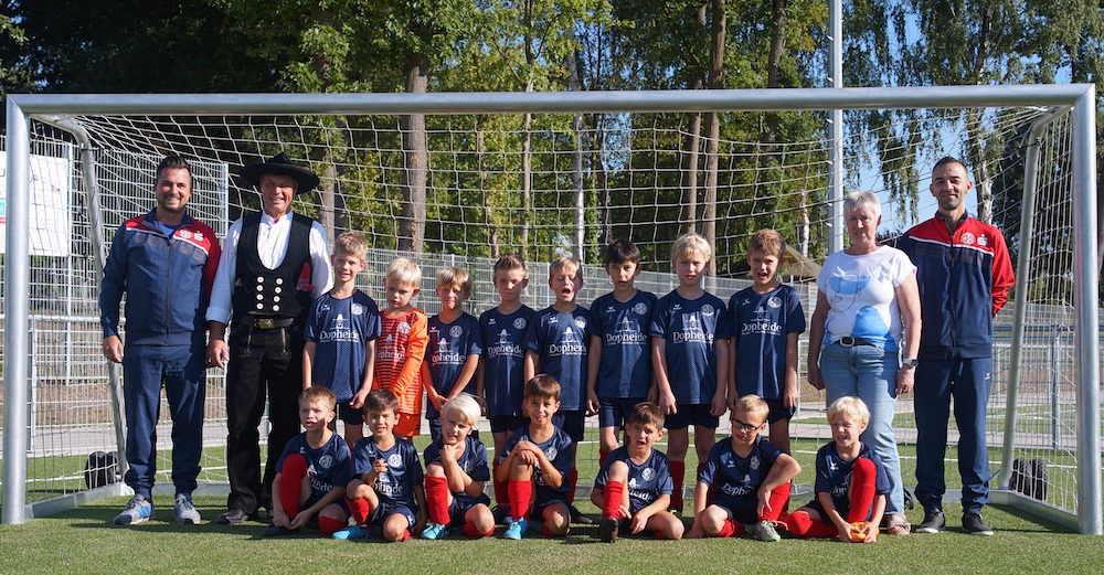 Die U8 I Fussball Jugendmannschaft der Warendorfer Sportunion e.V. möchte sich bei der Firma Dopheide aus Warendorf recht herzlich für einen neuen Trikosatz bedanken. Das Mannschaftsfoto zeigt die Mannschaft zusammen mit den Sponsoren Elisabeth und Thomas Dopheide sowie den Trainern Marco Kassab und Raffael Pichierri. (Foto: WSU)